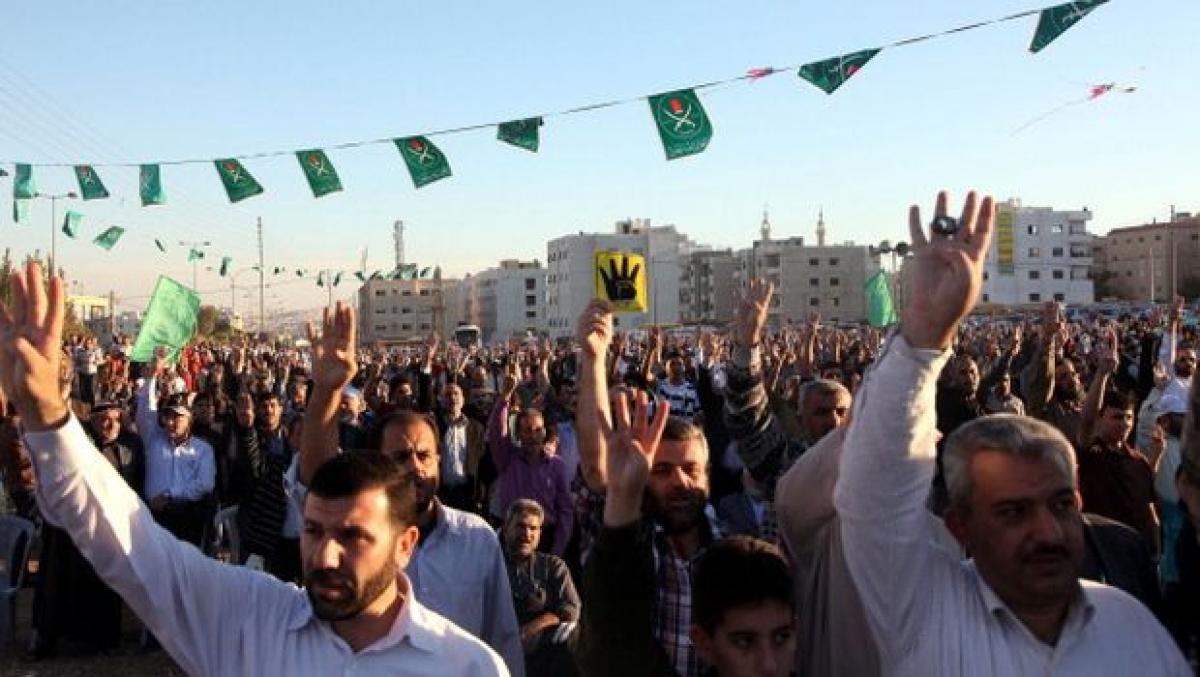Jordanians show the 'Rabia sign' during a rally organized by the Muslim Brotherhood to support its Egyptian counterpart on October 25, 2013 in Amman, Jordan. (Shadi Alnsoor/Anadolu Agency/Getty Images)[/caption]Caution has been the preeminent feature of the Jordanian Muslim Brotherhood’s response to Saudi Arabia’s announcement that it had classified the organization a terrorist group. Perhaps they are gambling on there being opportunities to reconcile or alter the situation in the future. Maybe they don’t think the announcement is actually about them, but is instead mainly about the Brotherhood in Egypt.