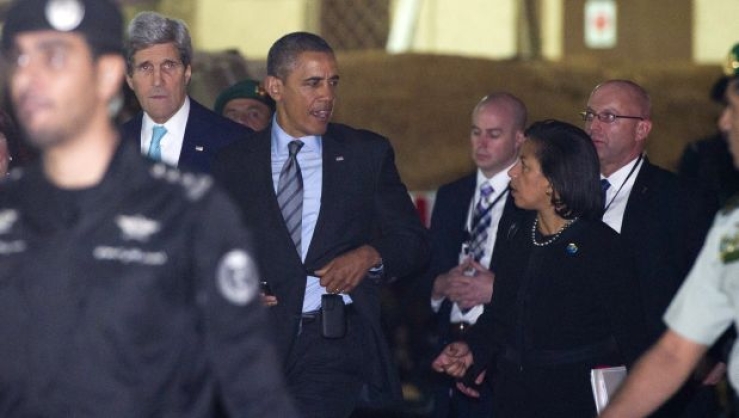 [caption id="attachment_55249662" align="alignnone" width="619"]US President Barack Obama, US National Security Adviser Susan Rice (R) and Secretary of State John Kerry (L) leave after meeting with King Abdullah of Saudi Arabia at Rawdat Khurayim, the monarch's desert camp 60 miles (35 miles) northeast of Riyadh on March 28, 2014. (SAUL LOEB/AFP/Getty Images) US President Barack Obama, US National Security Adviser Susan Rice (R) and Secretary of State John Kerry (L) leave after meeting with King Abdullah of Saudi Arabia at Rawdat Khurayim, the monarch's desert camp 35 miles northeast of Riyadh, on March 28, 2014. (SAUL LOEB/AFP/Getty Images)[/caption]