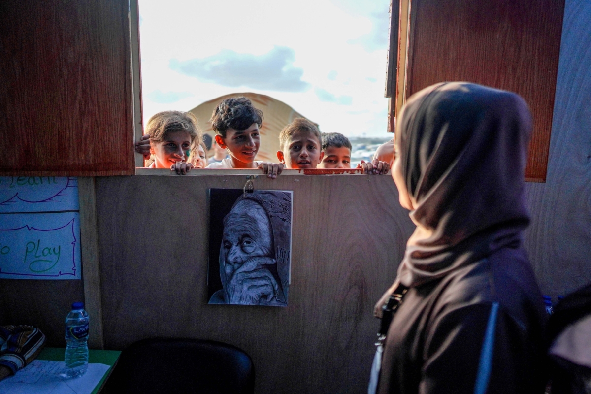 Children attend class at a makeshift school in a camp for displaced Palestinians in Deir El-Balah, in the central Gaza strip on April 27, 2024.