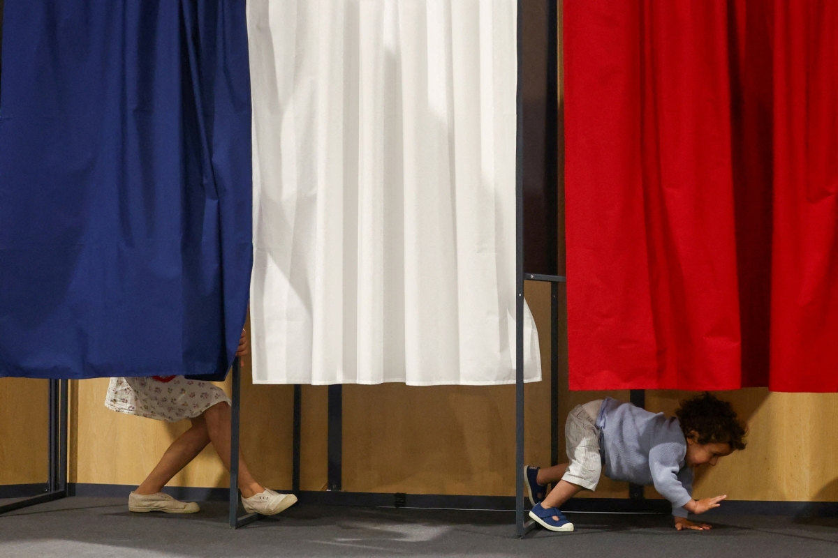 Romy, 8, and Jude, 2, play at a polling station during the European Parliament election, in Le Touquet, France, June 9, 2024.