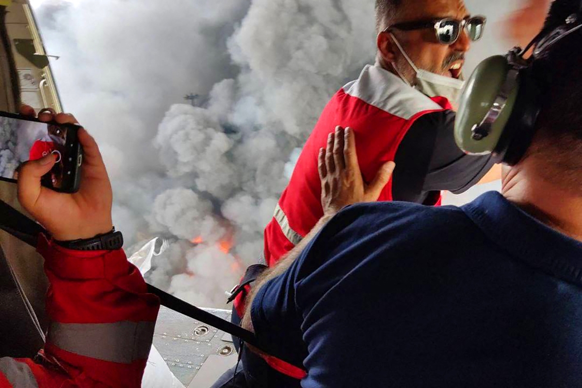 A rescue team arrives by helicopter at the scene of an explosion that took place a day earlier at the Shahid Rajaee port dock southwest of Bandar Abbas in the Iranian province of Hormozgan on April 27, 2025.