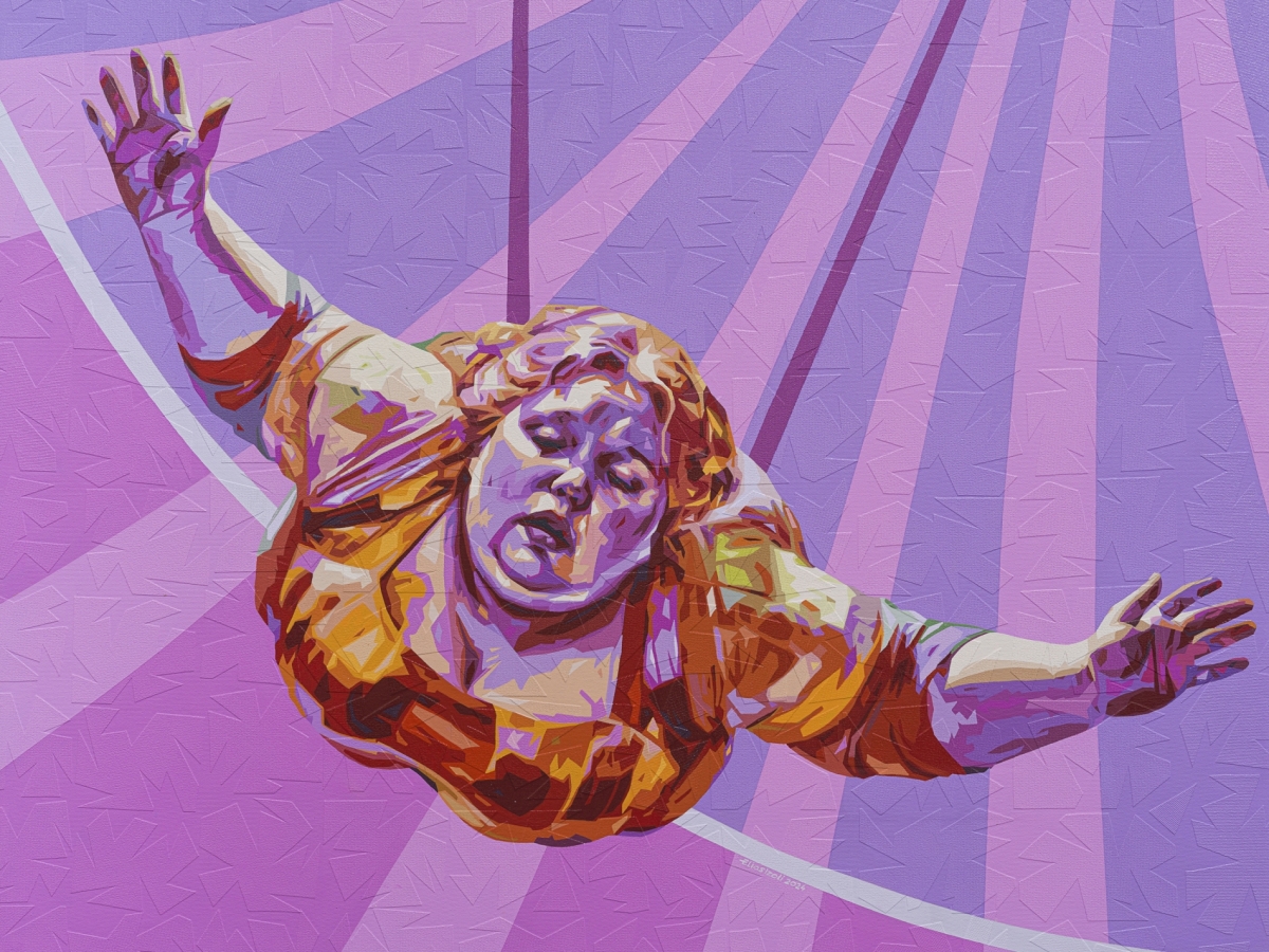 What seems like lightness is heavily laden with emotional weight. In one painting, a performer walks a tightrope while bearing a suitcase on his back. Izoli does not depict these corpulent, half-naked figures in the endearing manner of Fernando Botero, with his indulgent women. Instead, he uses them to expose the existential tension between lightness and weight.