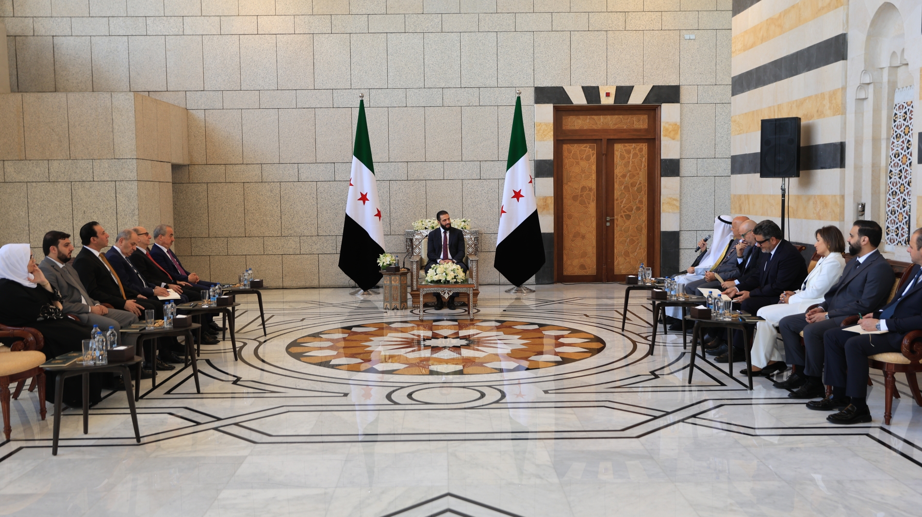 An Arab media delegation, comprising directors of media institutions, editors-in-chief of Arab newspapers, and former information ministers, met with al-Sharaa at the presidential palace in Damascus, August 24, 2025.