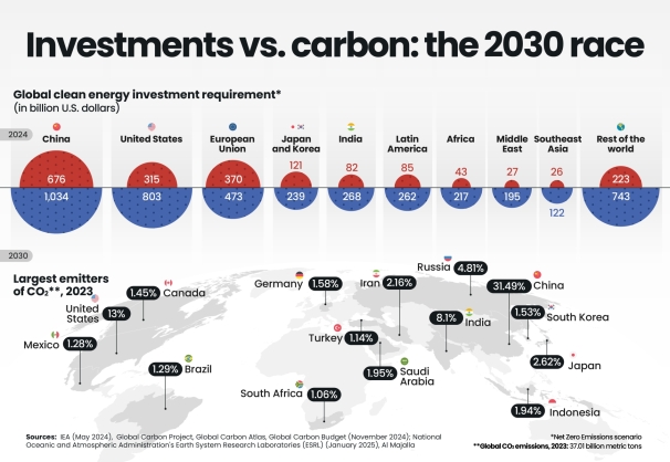 Together, China and the US account for more than half of the world's clean energy investments, while the four biggest polluters produce roughly 60% of total emissions, underscoring the concentration of climate responsibility.