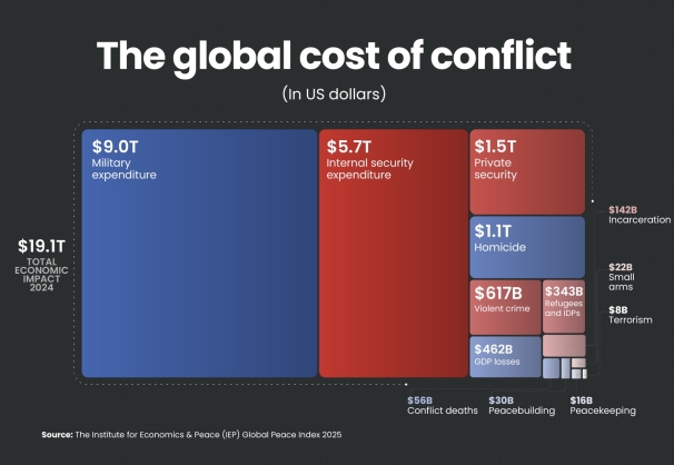 In 2024, the global economic toll of violence climbed to $19.1tn—a drastic increase of $717bn from the previous year. This surge coincided with the highest number of conflict-related deaths in 25 years and the continuation of major wars in Ukraine and Gaza. Heightened geopolitical instability pushed many countries, especially in Europe, to dramatically raise their defence budgets. Even Japan announced plans to double its military spending to 2% of GDP.