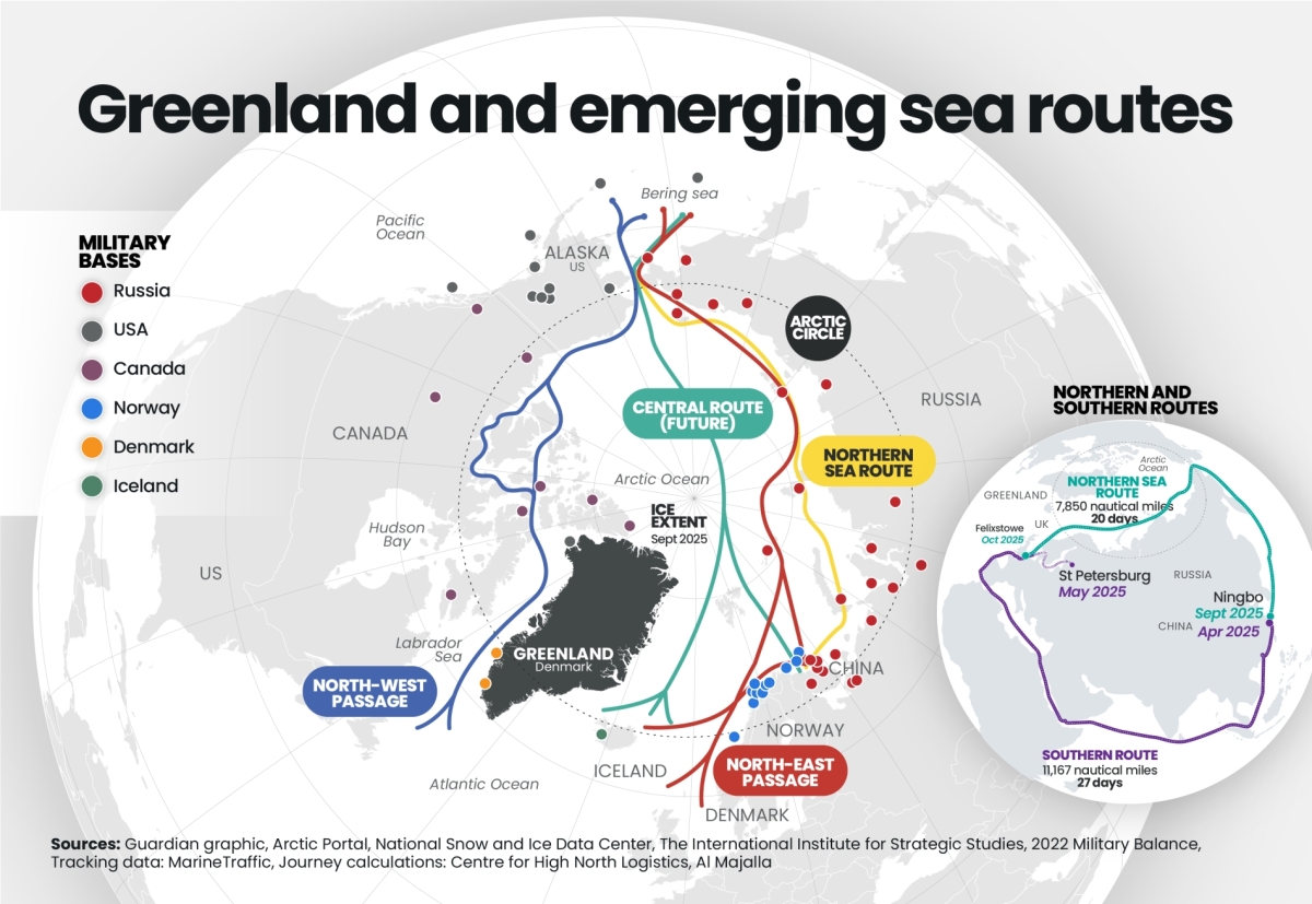 Against this backdrop, the Arctic region is also seeing a growing military build-up. The US has military bases in Greenland, while Russia is restoring the Soviet-era infrastructure in the Arctic and expanding its military bases there. For its part, China asserted in 2018 that it was a “near-Arctic state” and deployed three icebreaking vessels to the region in 2024.