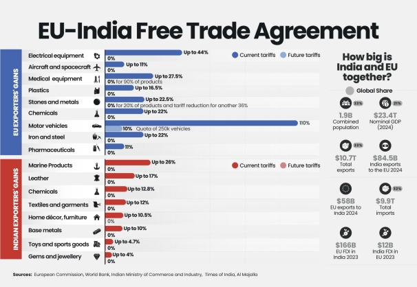 Under the deal, the EU expects its exports to India to double by 2032. Tariffs will be eliminated or reduced on 96.6% of traded goods by value, generating annual savings of about €4bn ($4.75bn) for European companies. In parallel, the EU will cut tariffs on 99.5% of goods imported from India over seven years, bringing duties to zero on key products, materials, and metals. India will gradually reduce tariffs on European cars from 110% to 10% and abolish duties on car parts within five to ten years, benefiting firms such as Renault, Volkswagen, BMW, and Mercedes.