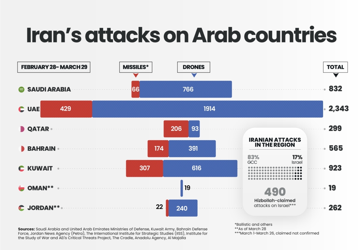 In total, approximately 5,200 projectiles were launched in the first month of war, with the United Arab Emirates the most heavily targeted, followed by Kuwait, Saudi Arabia, Bahrain, and Qatar, while Oman saw limited spillover.