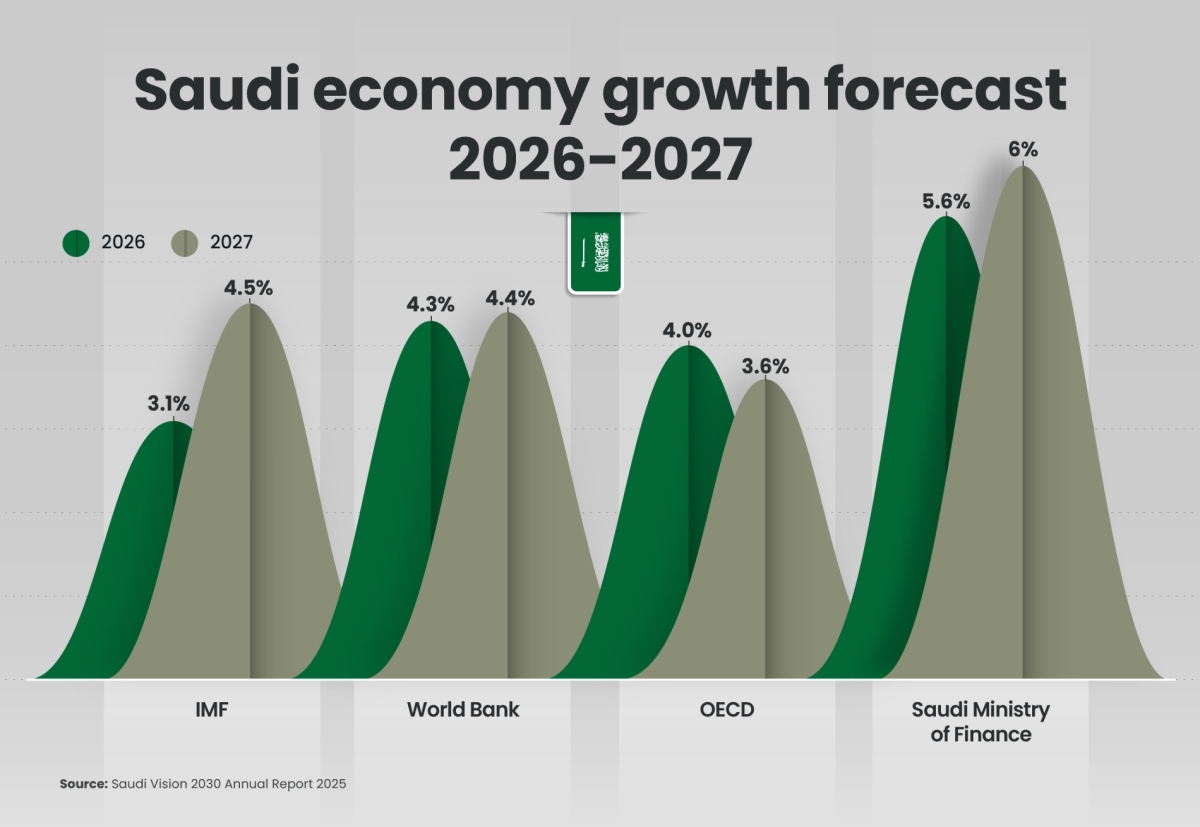 For its part, the International Monetary Fund (IMF), the World Bank, and the Organisation for Economic Cooperation and Development (OECD) expect the Saudi economy to maintain a positive growth trajectory through 2026 and 2027, despite ongoing volatility in global oil markets. The IMF projects growth of around 3.1% in 2026, accelerating to approximately 4.5% in 2027, driven largely by the continued expansion of non-oil sectors and the impact of structural reforms.