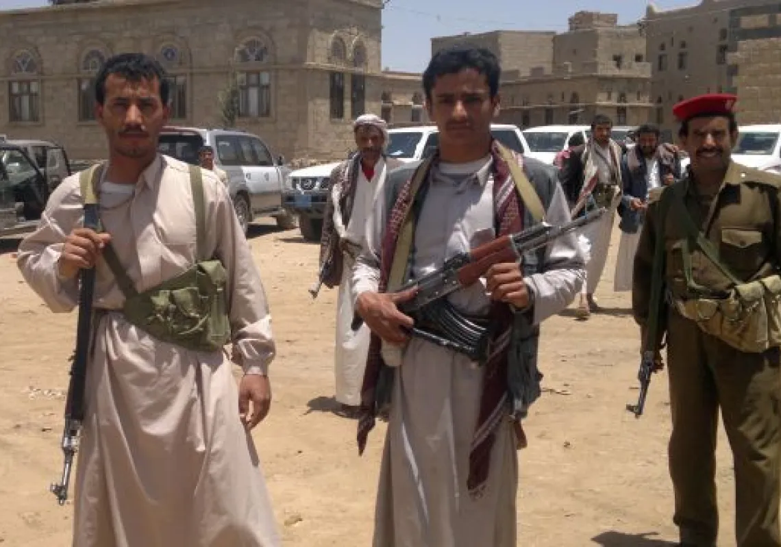 [caption id="attachment_55250560" align="alignnone" width="620"] Houthi tribesmen walk near a Yemeni soldier in Amran on April 10, 2014 as they gather for a rally against the death of five people…