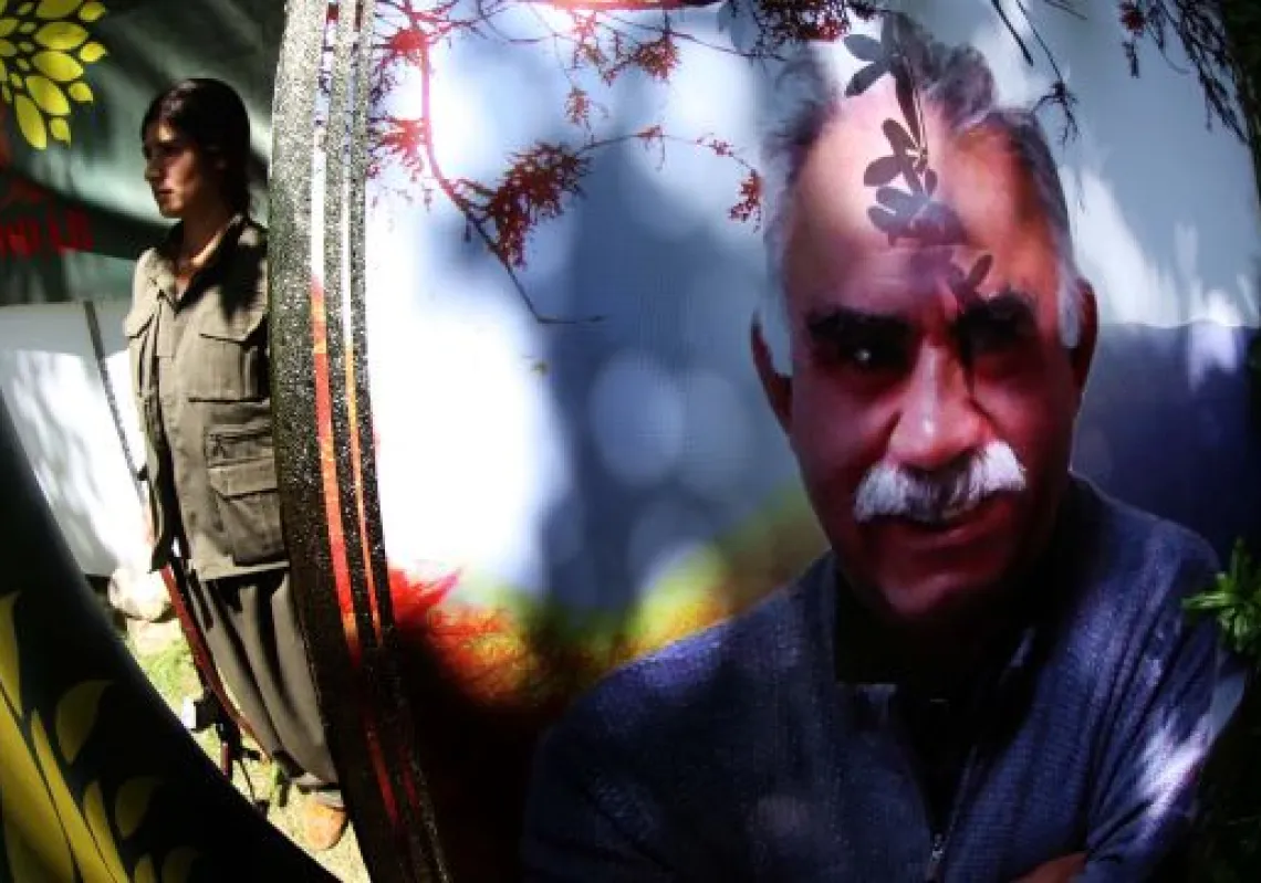 [caption id="attachment_55250549" align="alignnone" width="620"] A member of the Party of Free Life of Kurdistan (PJAK) stands near a poster of jailed Kurdistan Workers' Party (PKK) leader Abdullah…