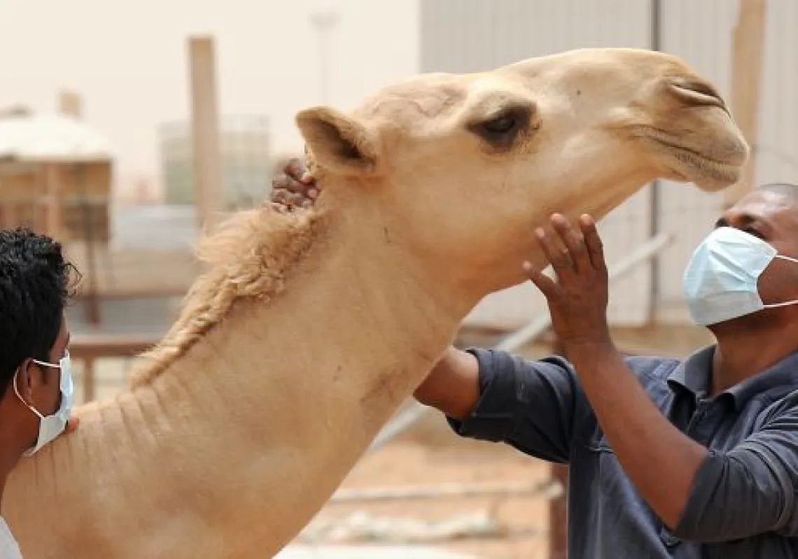 [caption id="attachment_55250274" align="alignnone" width="620"] An Indian worker wears a mouth and nose mask as he touches a camel at his Saudi employer's farm on May 12, 2014, outside Riyadh. …