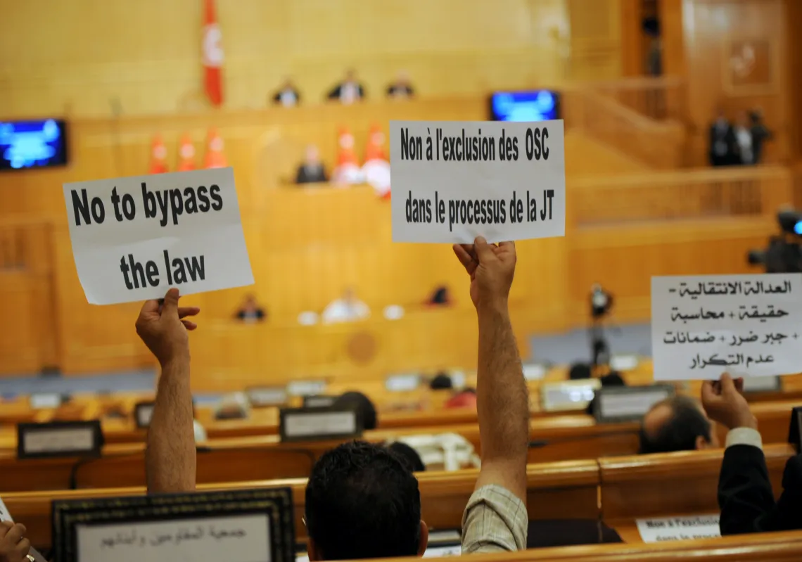 [caption id="attachment_55250343" align="alignnone" width="620"] Tunisians, who are also victims of torture, protest during a ceremony to unveil the Truth and Dignity Commission on June 9, 2014, in…