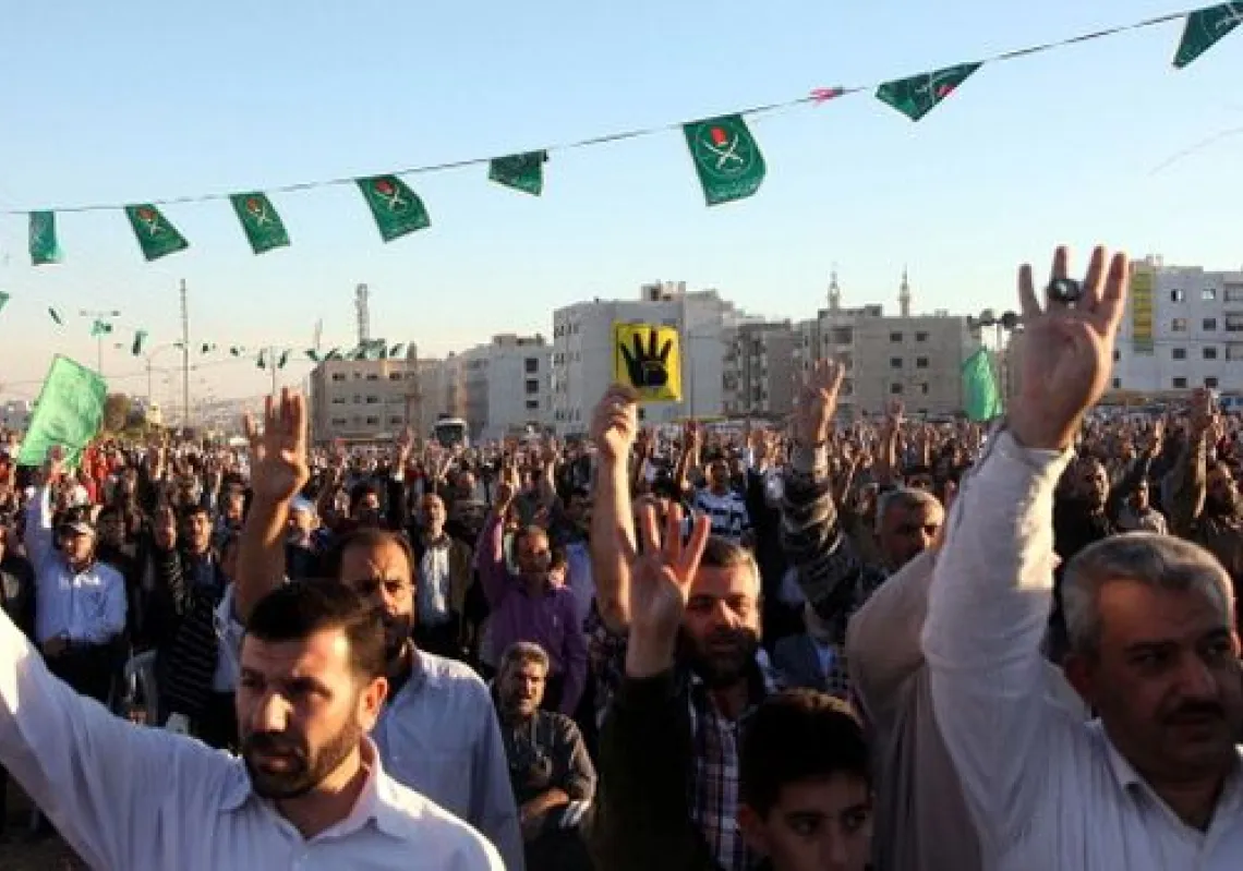 [caption id="attachment_55249313" align="alignnone" width="620"] Jordanians show the 'Rabia sign' during a rally organized by the Muslim Brotherhood to support its Egyptian counterpart on October 25,…