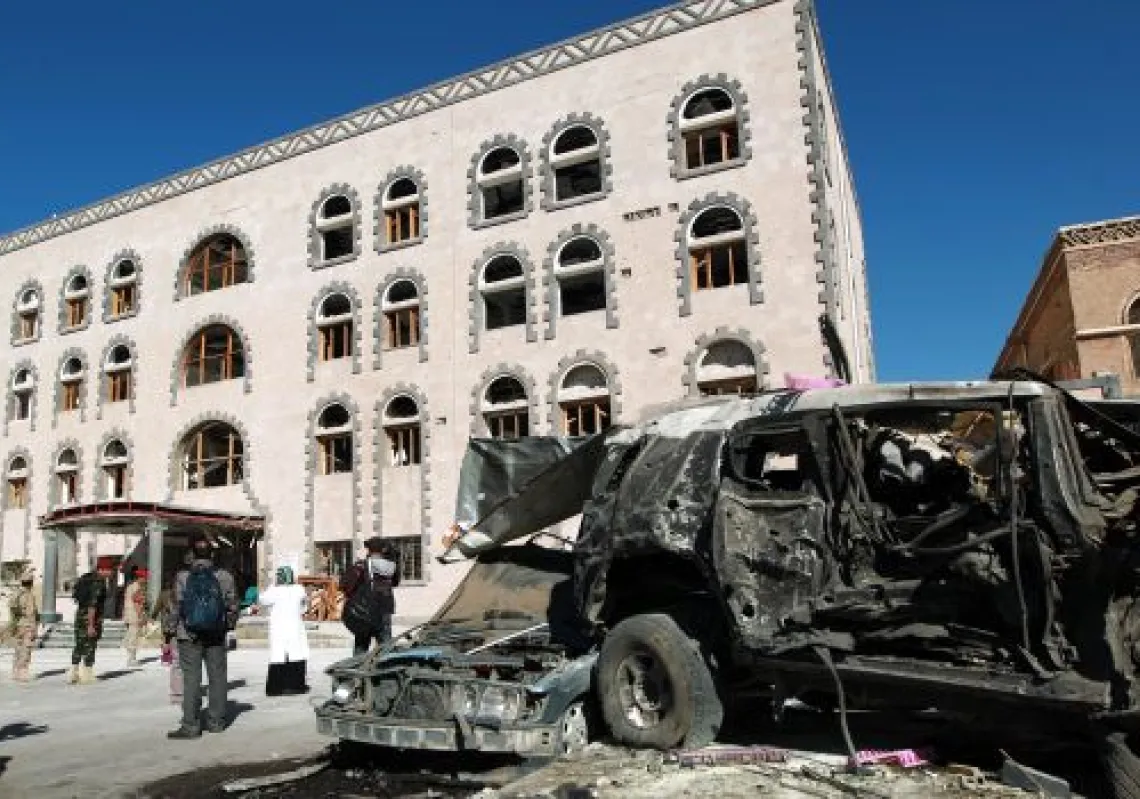 [caption id="attachment_55247981" align="alignnone" width="620"] People visit the scene of the attack on the Yemeni defense ministry that took place on December 5, following the funeral of victims of…