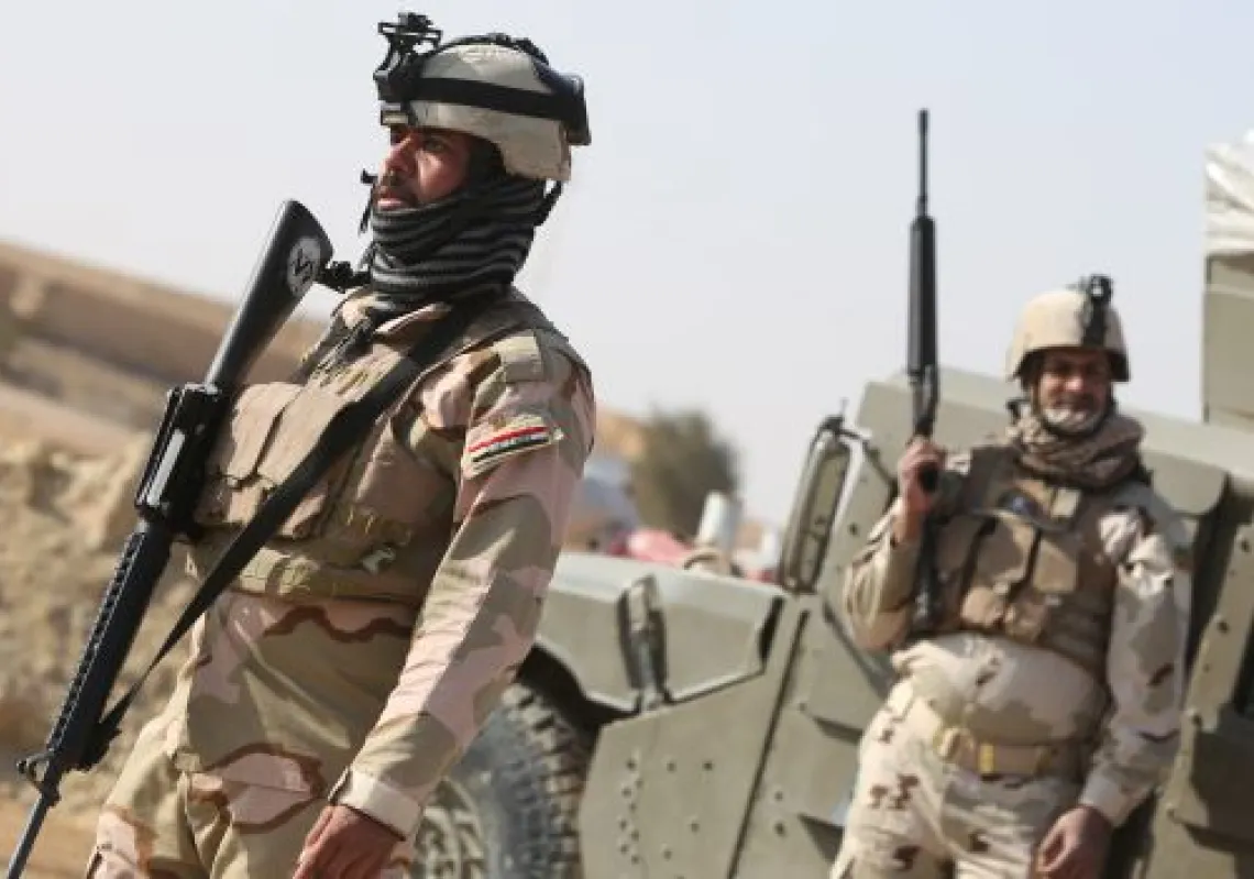 [caption id="attachment_55247871" align="alignnone" width="620"] Iraqi soldiers stand along a road close to their vehicle in the area of Ein Tamer, which leads west out of the central Iraqi Shi'ite…