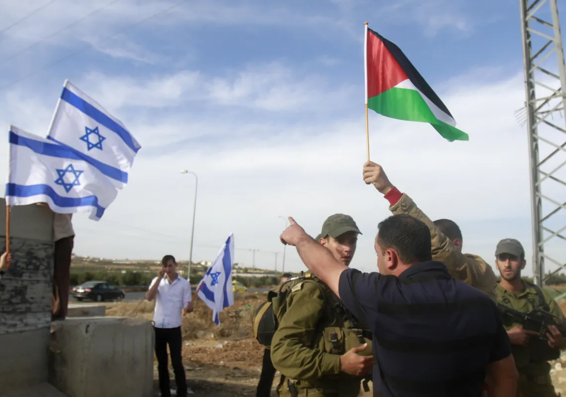 [caption id="attachment_55247005" align="alignnone" width="620"] A Jewish settler places the Israeli flag on a road sign while Israeli troops encircle Palestinian villagers protesting after the…