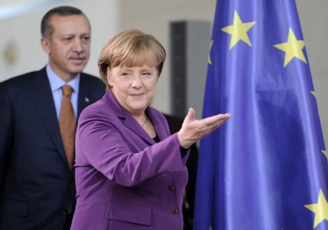 [caption id="attachment_55246649" align="alignnone" width="594"] German Chancellor Angela Merkel leads Turkish Prime Minister Recep Tayyip Erdoğan to the lectern for a statement following a ceremony…