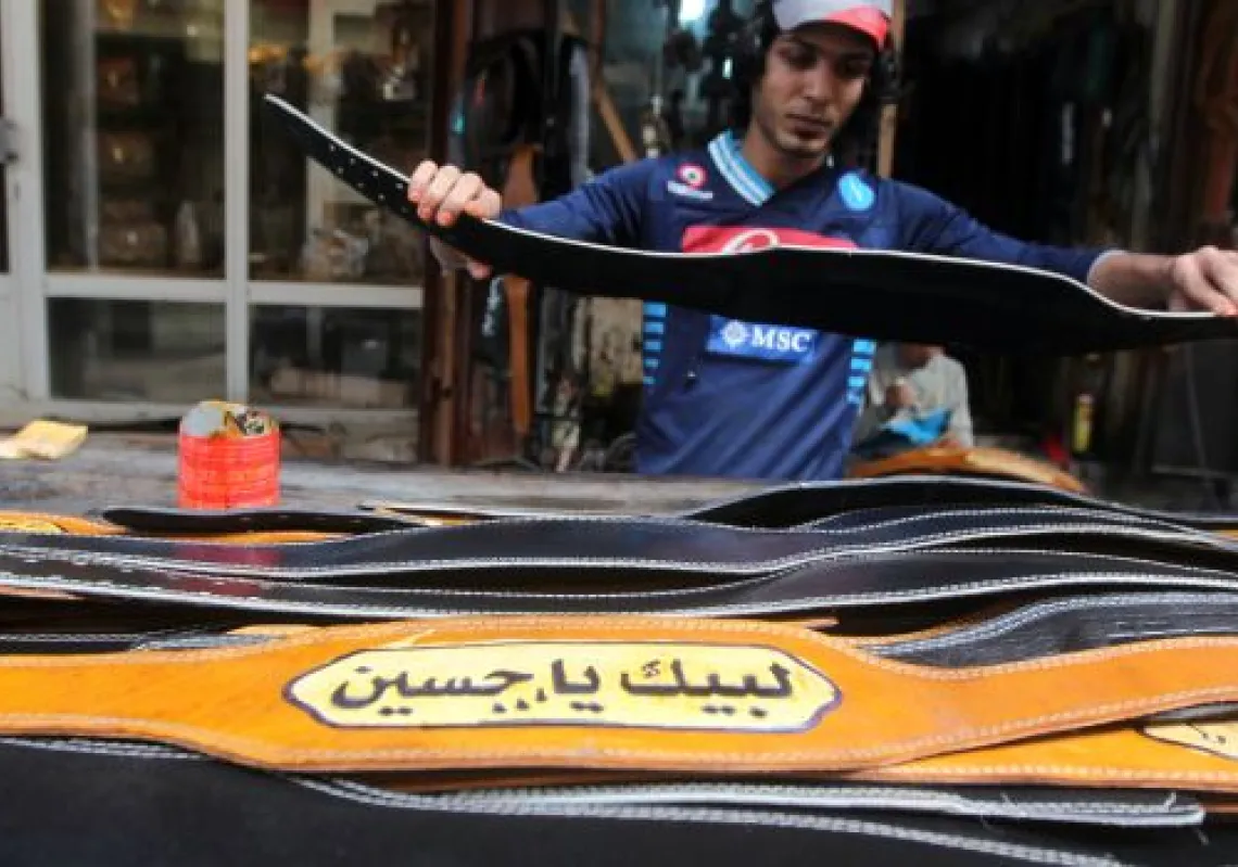 [caption id="attachment_55246541" align="alignnone" width="620"] An Iraqi youth checks a leather belt being made especially for the annual Shiite Muslim commemoration of Ashura with the saying…