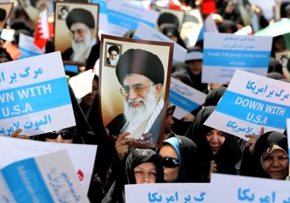 [caption id="attachment_55246145" align="alignnone" width="620"] Iranian demonstrators hold up portraits of the Islamic republic's supreme leader, Ayatollah Ali Khamenei, and wave placards with the…