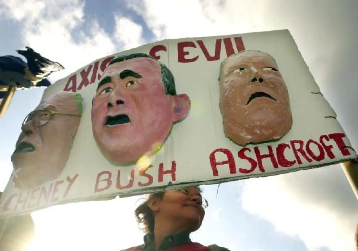 [caption id="attachment_55246064" align="alignnone" width="594"] A woman holds a sign depicting US President George W. Bush, Vice President Dick Cheney and Attorney General John Ashcroft as the "axis…