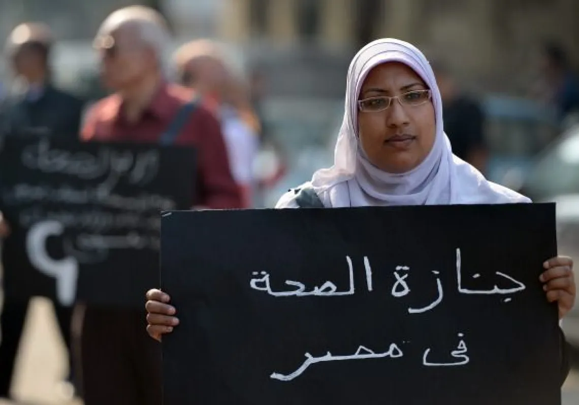 [caption id="attachment_55246110" align="alignnone" width="594"] An Egyptian doctor who is on strike carries a placard that reads "The funeral of Egypt's health" during a march in central Cairo on…