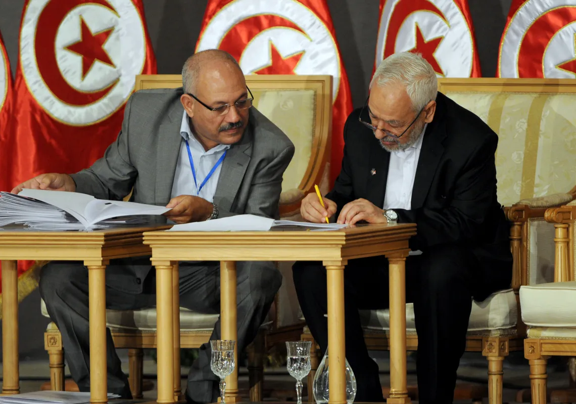 [caption id="attachment_55246086" align="alignnone" width="620"] Tunisia's ruling Islamist Ennahda party's leader Rachid Ghannouchi (R) signs documents during a meeting as part of the dialogue…
