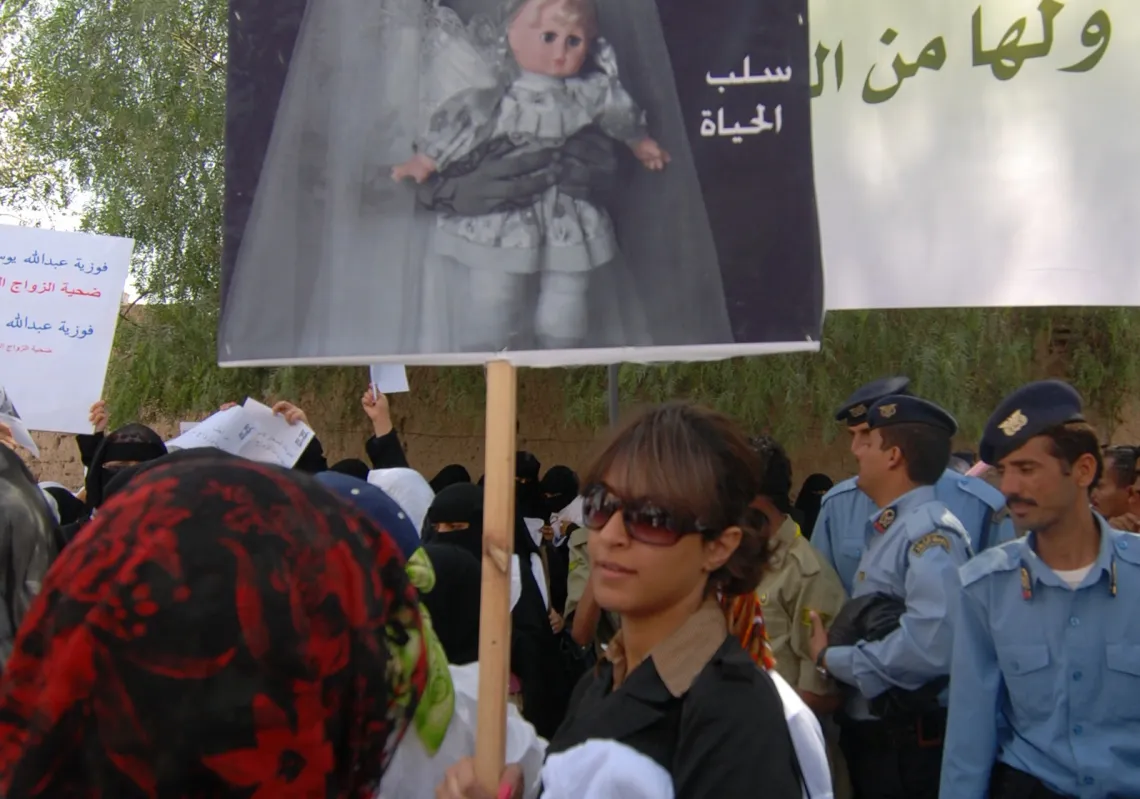 [caption id="attachment_55245479" align="aligncenter" width="619"] A Yemeni woman hold a picture of a child bride during a rally near the parliament in Sanaa on March 23, 2010 to show support to a…