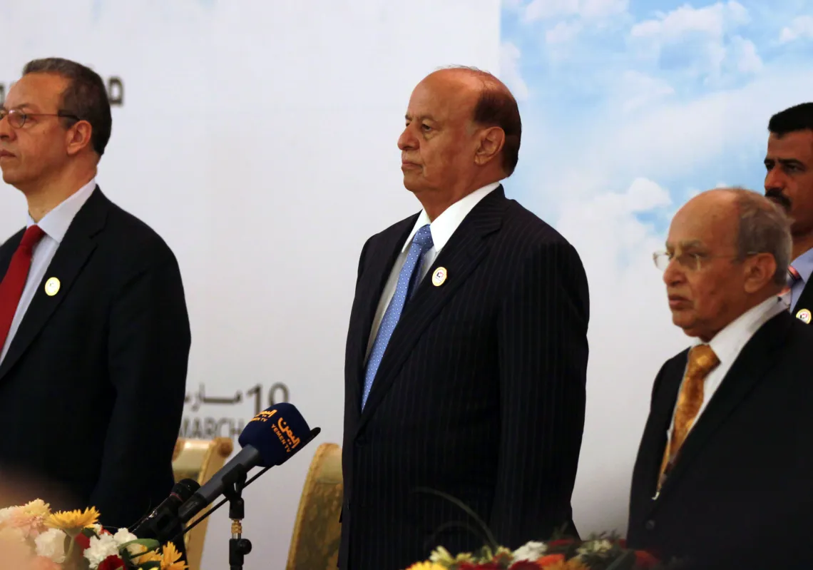 [caption id="attachment_55245366" align="aligncenter" width="620"] Yemen's President Hadi stands amidst officials during the opening of a national dialogue conference in Sanaa on March 18, 2013 …