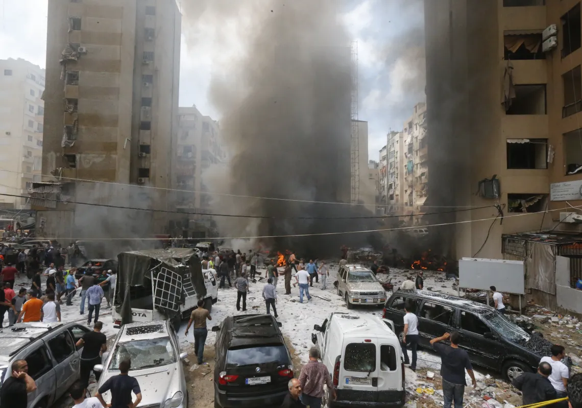 [caption id="attachment_55245219" align="alignnone" width="620"] Firefighters and residents gather at the site of an explosion in Beirut's southern suburb neighborhood of Bir Al-Abed on July 9, 2013…