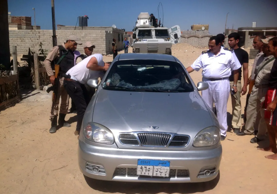 [caption id="attachment_55244662" align="alignnone" width="620"] Egyptian policemen inspect the car of a Coptic Christian priest killed in Al-Arish, north of the Sinai peninsula on July 6, 2013. (STR…