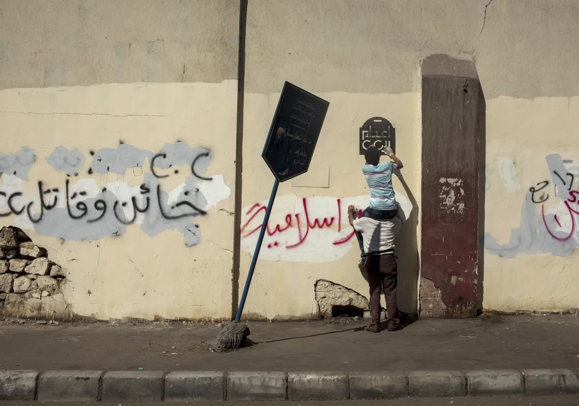 [caption id="attachment_55244494" align="alignnone" width="620"] Supporters of deposed Egyptian President Mohammed Mursi spray slogans on a wall during a march through the Nasr City district on the…