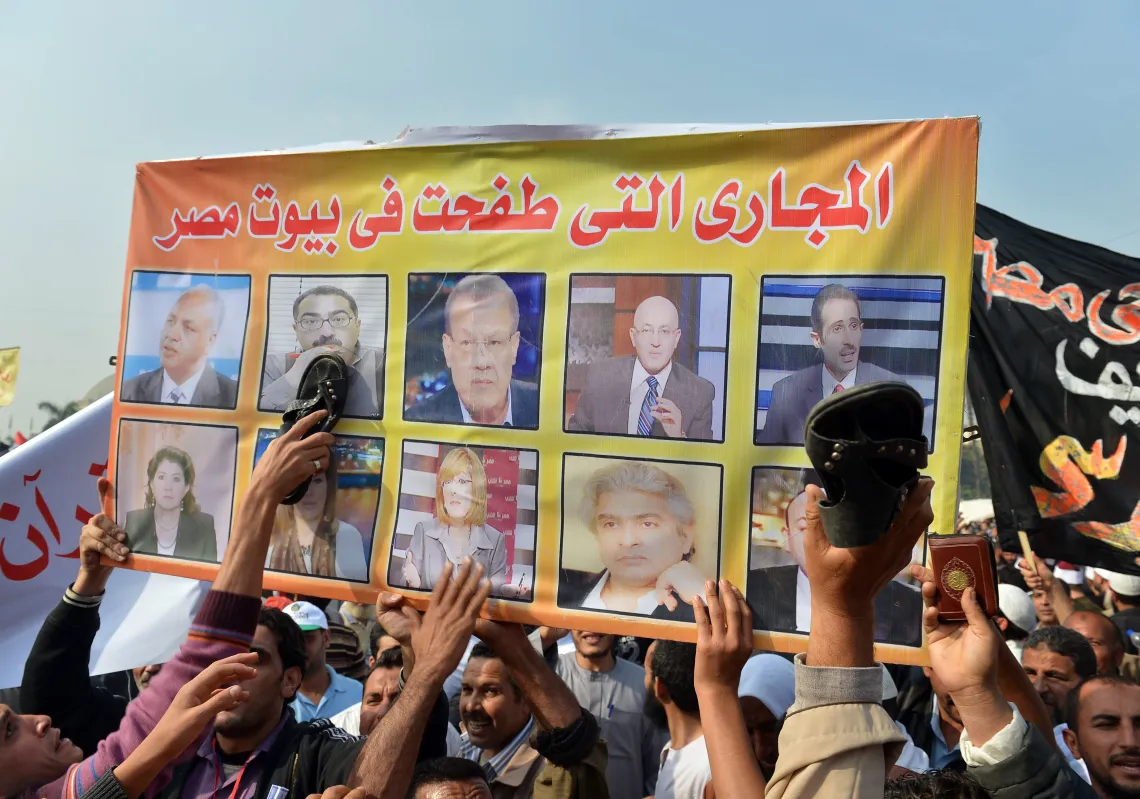 [caption id="attachment_55243281" align="alignnone" width="620"] Protesters use their slippers to hit portraits of famous Egyptian talk show hosts during a rally in front of Cairo's University in…