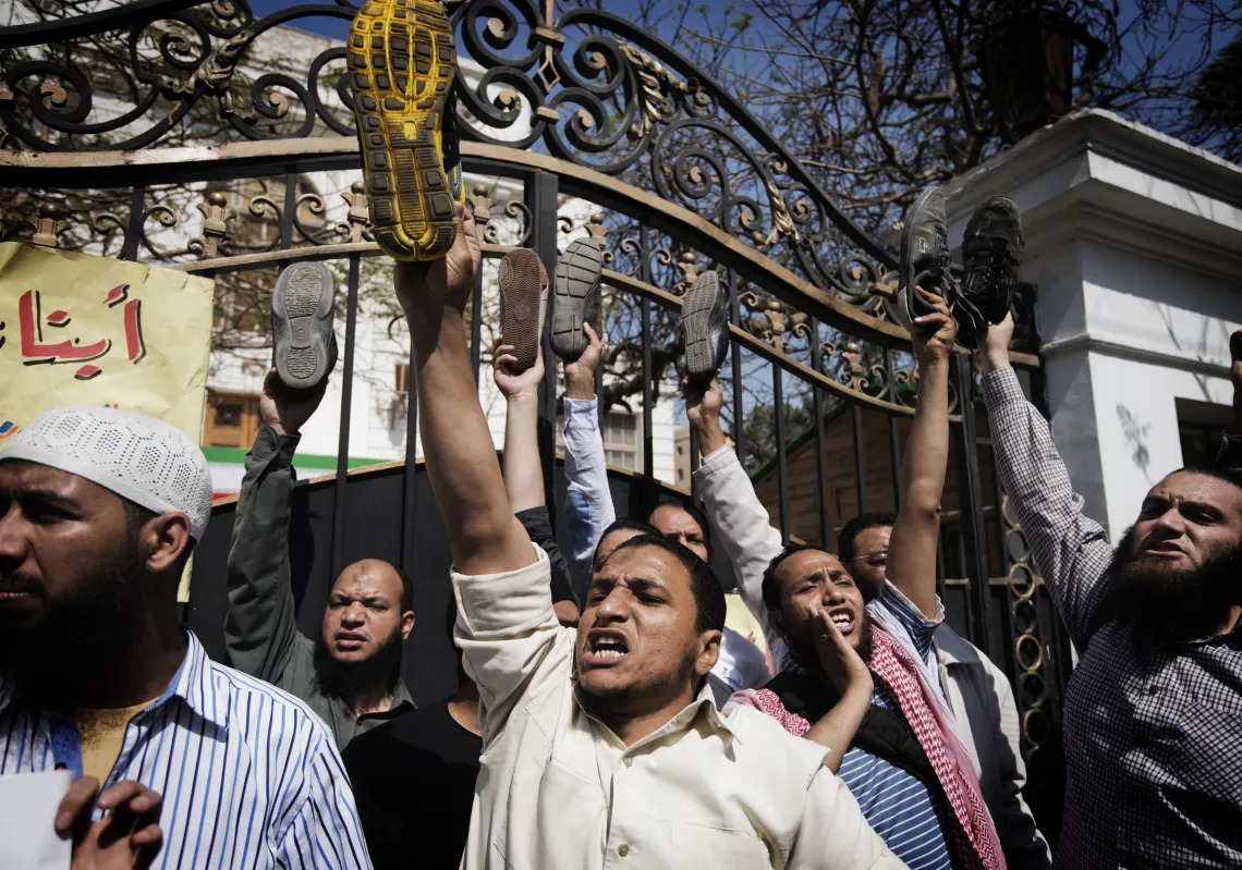 [caption id="attachment_55243379" align="aligncenter" width="620"] Egyptian protesters raise their shoes as they shout political and religious slogans outside the Iranian ambassador's residence in…