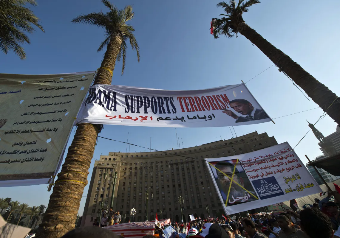 [caption id="attachment_55243255" align="aligncenter" width="620"] Egyptian protesters walk under banners against US President Barack Obama (top) and his Egyptian counterpart Mohamed Mursi as…