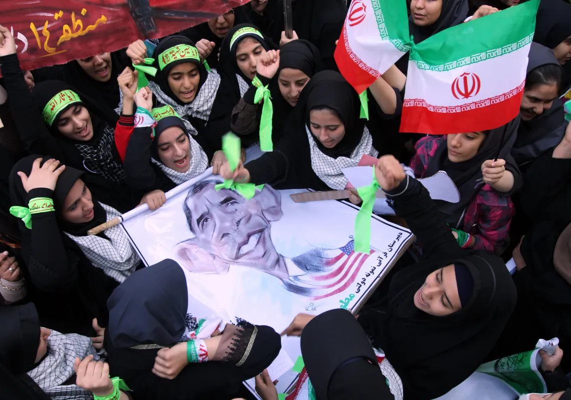 [caption id="attachment_55242888" align="aligncenter" width="620"] Iranian women hold an anti-US sign, bearing a cartoon of US President Barack Obama, outside the former US embassy in Tehran on…