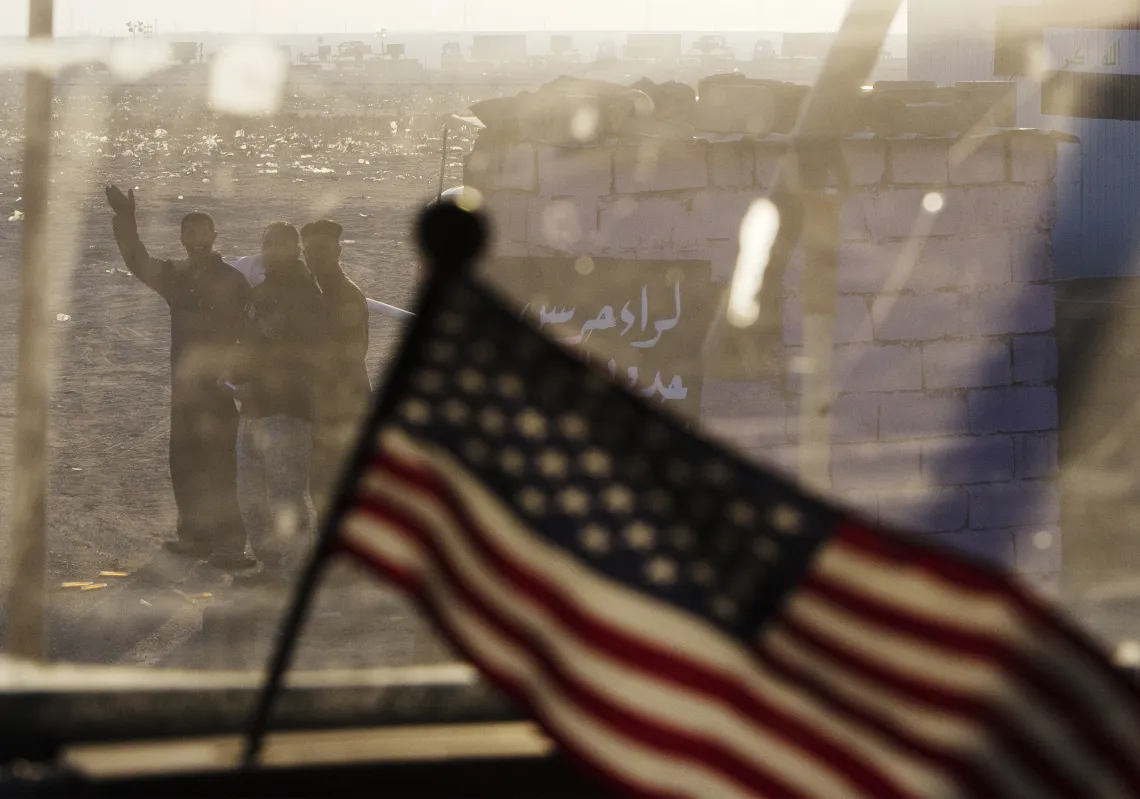 [caption id="attachment_55242559" align="alignnone" width="620"] Iraqis wave behind a US flag on the dashboard of a Mine Resistant Ambush Protected (MRAP) vehicle, part of the last US military convoy…