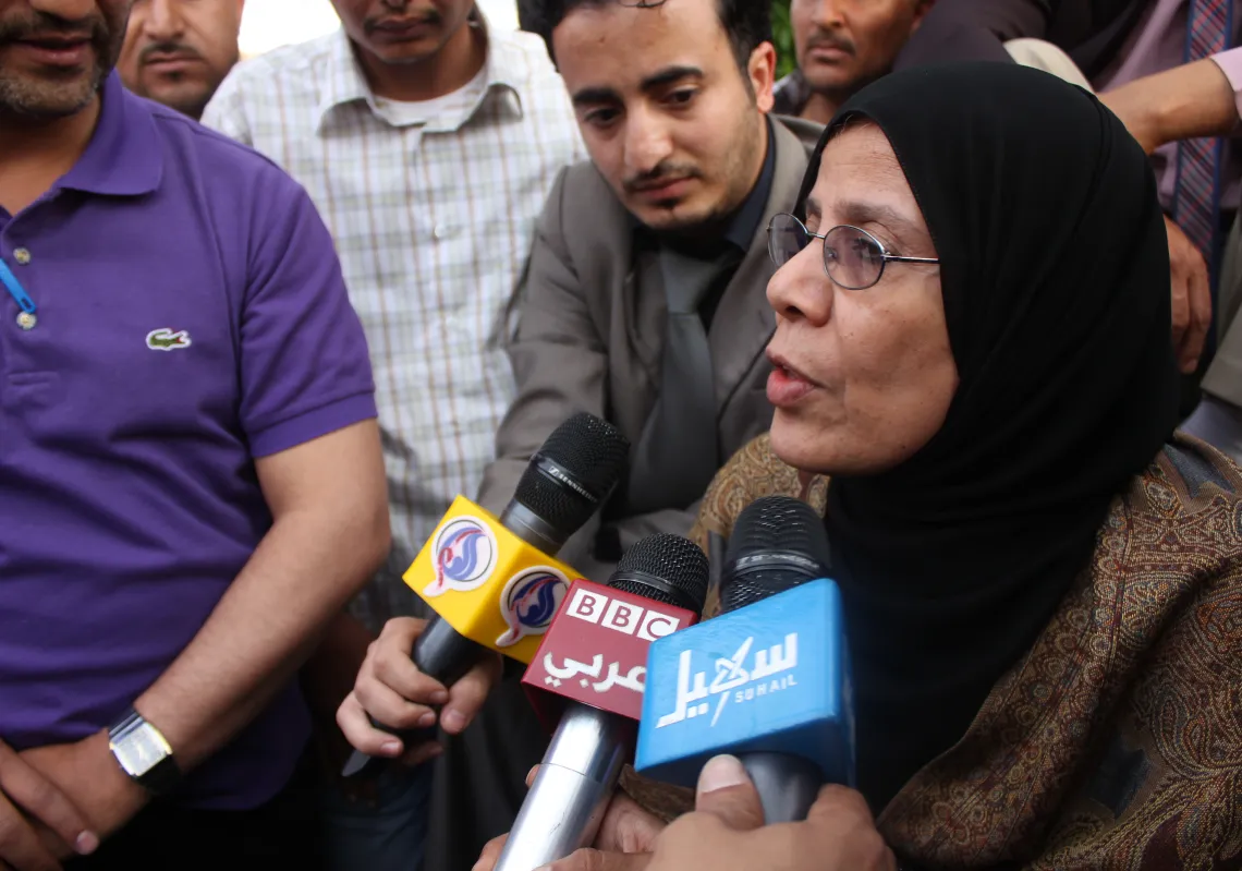 [caption id="attachment_55242258" align="aligncenter" width="620"] Yemen's human rights minister, Huriya Mashour, answers journalists' questions. She joined youth activists who went on hunger strike…