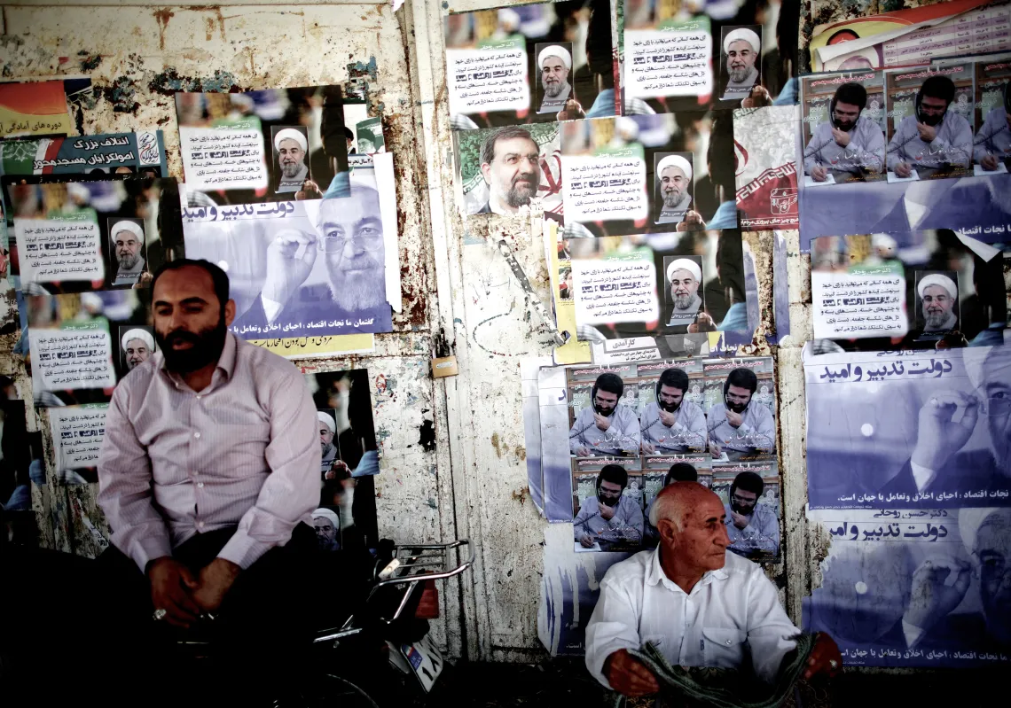 [caption id="attachment_55242206" align="aligncenter" width="620"] Iranians sit next to electoral posters of Hassan Rouhani (L) and Mohsen Rezaei (C) in the religious city of Qom, some 80 miles south…