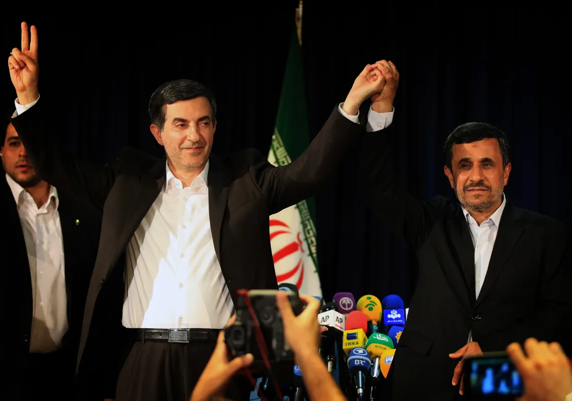 [caption id="attachment_55241302" align="aligncenter" width="620"] Iranian president Mahmoud Ahmadinejad (R) and Esfandiar Rahim Mashaei (L) wave during their press conference after Mashaei…