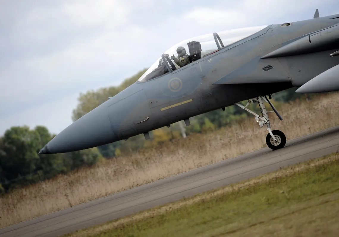 [caption id="attachment_55241339" align="aligncenter" width="620"] A Royal Saudi Air Force's F15C lands during an international training exercise in France in October 2009. (JEFF PACHOUD/AFP/Getty…